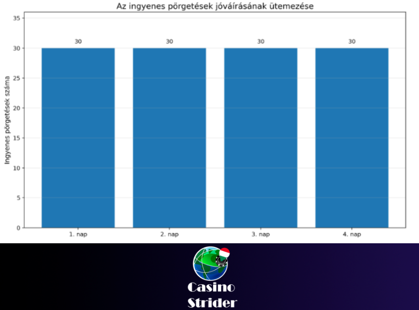 A jóváírás ütemezése külön is fontos, mert így előre látható, hogyan oszlik el a 120 ingyenes pörgetés a négy nap során.
